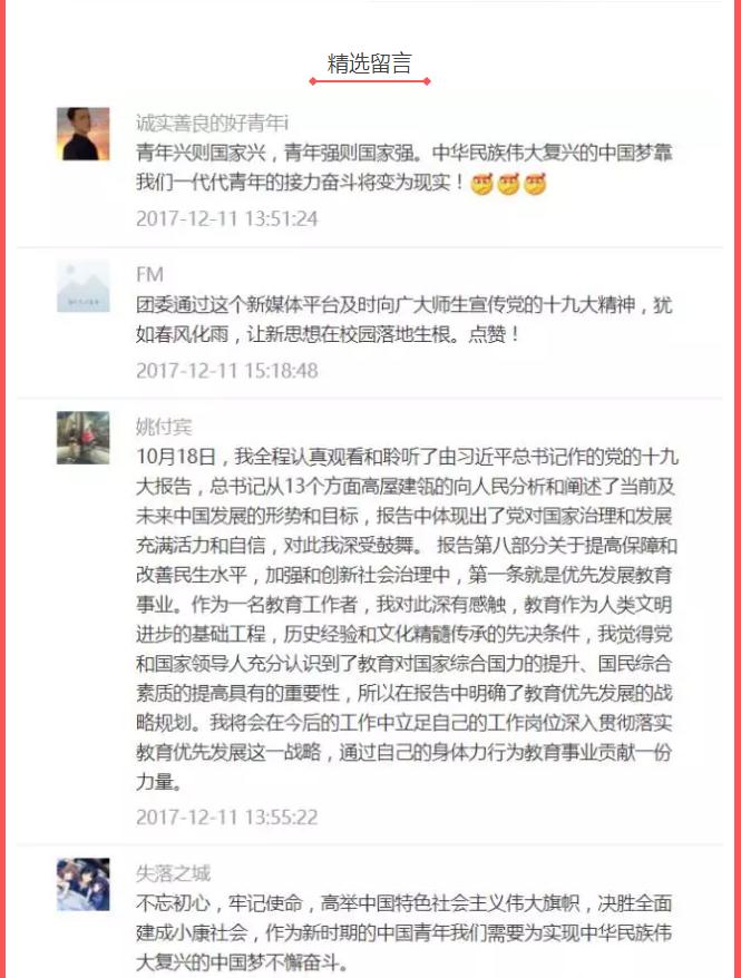 此次活动面向的群体是全校师生,为了拓宽学生的参与面,让十九大报告精神在学生中落地生根,此次活动通过校区微信公众号进行网络答题。自活动发布以来,吸引了众多学生参与。有些同学通过答题的方式积极参与知识竞答活动,有些同学通过留言的方式表达自己十九大报告学习的心得体会以及对于此次活动的意见和建议。